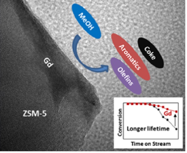 기존 제올라이트 촉매는 24시간 내로 초기촉매활성의 30% 이하로 떨어지는 단점이 있다. 그런데 새로 개발된 촉매는 24시간 후에도 초기촉매활성의 80% 이상 유지시킬 수 있다. 논문의 1저자인 김성탁 박사는 “희토류 금속인 가돌리늄을 제올라이트 표면에 코팅하게 되면 나노두께의 필름을 형성하고, 이 필름이 표면의 물리화학적 특성을 변화시켜 촉매 표면에 탄소생성을 저해하고 촉매의 수명이 연장되는 효과를 보인다”고 말했다.