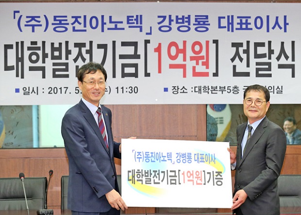 알루미늄 표면처리 전문업체인 ㈜동진아노텍 강병룡 대표이사가 24일 한국해양대학교에 발전기금 1억 원을 기탁했다.