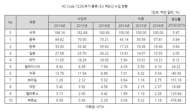 규제 대상에 새로이 추가된 HS Code 7229(기타 합금강의 선)의 최근 3년간 역외 총 수입액은 비슷한 추이를 보였다. 1위 수입국은 중국으로 2014년 총 역외 수입액의 43.14%를 차지한 이래로 꾸준히 전체 수입액에서 차지하는 비중이 감소하고 있다. 한국은 수입국 2위로 이번 개정으로 해당 품목이 감시문서 제출이 의무화 대상 품목이 됨에 따라 대EU 수출기업에 행정적인 부담이 있을 것으로 예상된다.