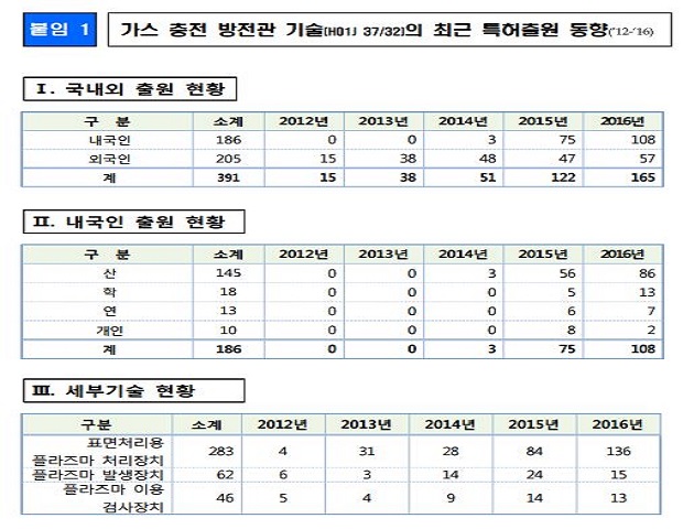 특허청에 따르면 플라즈마 관련 특허 출원은 2012년 15건에 불과하던 것이 2016년 165건으로 증가하여 최근 5년(2012~2016)간 급격한 증가세를 보이고 있다.