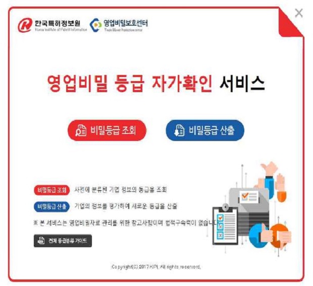 한편, 영업비밀 등급 자가확인 서비스는 영업비밀보호센터 홈페이지(www.tradesecret.or.kr)를 통해 제공되며, 등급 분류 및 영업비밀 보호 방법에 관한 구체적인 사항은 영업비밀보호센터(1666-0521)로 문의하면 된다.