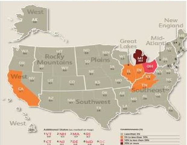 2017년 미국 내 자동차 스탬핑 부품 제조기업 분포. (출처=IBIS World)