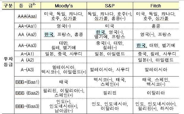 국가 신용평가보고서에 따르면, 우리나라 현행 등급이 ‘높은 수준의 경제 회복력(economic resiliency)’, ‘재정규율(fiscal discipline) 및 적정 수준의 정부부채(moderate government debt)’, ‘제도적 강점(robust institute)’, ‘낮은 대외위험성(very low external vulnerabilities)’에 기인한다고 평가되고 있다.