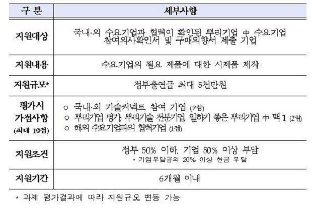 지원대상은 국내외 수요기업과 협력이 확인된 뿌리기업 중 수요기업 참여의사확인서 및 구매의향서를 제출한 기업으로, 수요기업의 필요 제품에 대한 시제품 제작을 지원하게 된다.