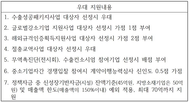 수출유망중소기업에 지정된 기업은 2년 동안 중소기업청, 방위사업청, 중소기업진흥공단, 한국무역보험공사, KOTRA, 한국무역협회, 신용보증기금, 한국수출입은행 등 23개 수출 지원기관에서 우대 지원 혜택을 받을 수 있다.
