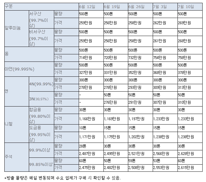 7월 10일 조달청 비철금속 비축물자 방출가격