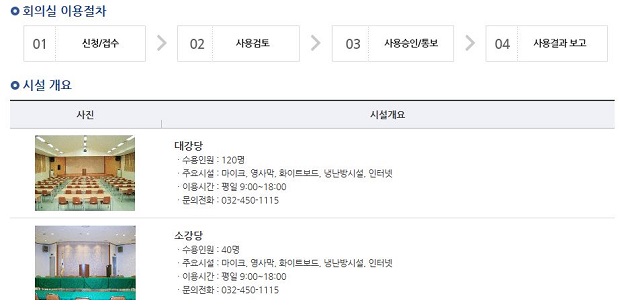 대관을 희망하는 기업 및 기관 등은 인천중기청 홈페이지(www.smba.go.kr/site/incheon/main.do > 회의실 이용 > 예약신청)를 통해 온라인으로 신청·접수가 가능하다.