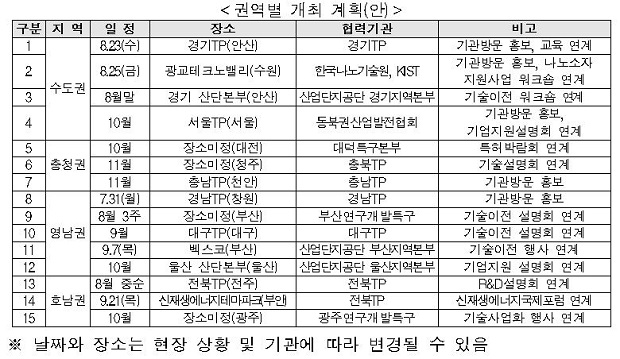 오는 31일 기술혁신 기업이 밀집한 경남테크노파크를 시작으로, 오는 11월까지 수도권·충청권·영남권·호남권 등 권역별 주요 산업단지 및 테크노파크 등 기업 밀집 지역에서 총 15회 내외로 진행된다.