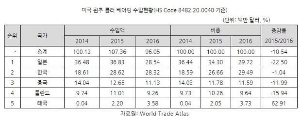 2015년과 2016년 사이 미국의 총 원추 롤러 베어링 수입량은 10.54% 감소한 반면, 한국산 수입량은 1.04%만 감소했다. 미국 내 수입 원추 롤러 베어링 시장점유율 1위부터 4위를 기록한 국가 중 2015년과 2016년 사이 유일하게 한국만 한 자릿수 감소율을 기록했다.