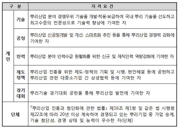‘뿌리산업 발전 유공’ 부문 ‘포상 분야별 자격요건(개인·단체)’
