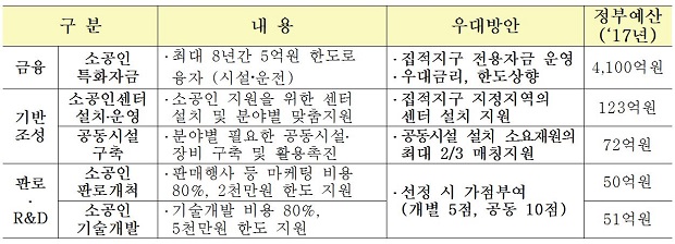 또한 집적지구 내 업체들은 소공인특화자금(최대 5억 원 한도 융자) 이용 시 금리 우대 혜택을 받을 수 있고, 판로 개척(최대 2,000만원) 및 R&D(최대 5,000만 원) 등 소상공인 지원 사업에 지원 시 가점을 주는 방식으로 우대를 받을 수 있다.