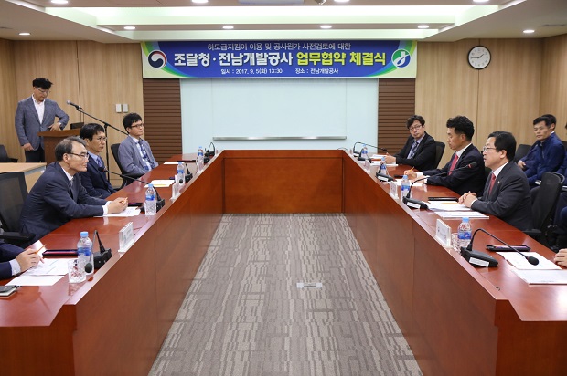 조달청은 지난 5일 전남개발공사(전라남도 무안군 소재)에서 전남개발공사와 하도급지킴이 이용 및 공사원가 사전검토에 관한 업무협약(MOU)을 체결했다.