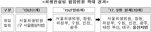 중기부는 도산 사건을 처리하는 전국 14개 모든 법원과 협업할 수 있도록 전주, 제주지법 등 미협약 법원과도 협업 확대를 추진함으로써 전국 대부분의 중소기업에게 회생절차 지원을 할 수 있는 협업기반을 마련할 계획이다.