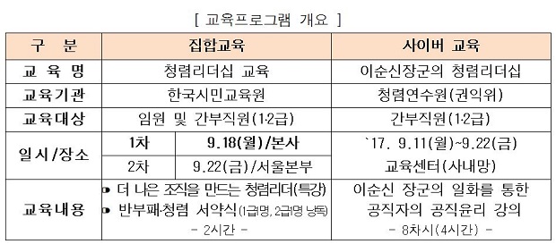 이번 청렴교육은 한국시민교육원 장동군 원장이 ‘더 나은 조직을 만드는 청렴리더’를 주제로 청렴의 본질적 의미와 청렴한 조직이 되기 위한 리더의 역할 등에 대해 강의를 진행할 예정이다.