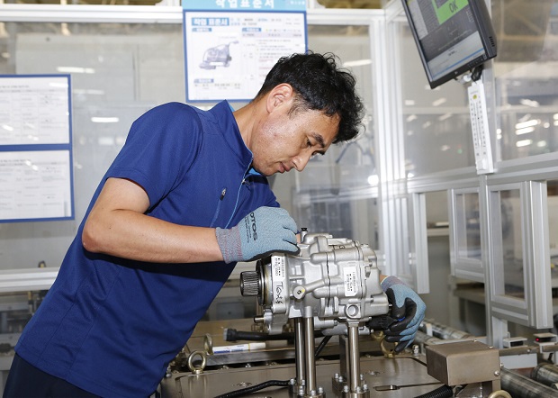 현대위아의 한 직원이 27일 경남 창원시 성산구 현대위아 창원3공장에서 전자식 차동 제한장치(e-LSD)를 검수하고 있다. (사진=현대위아)