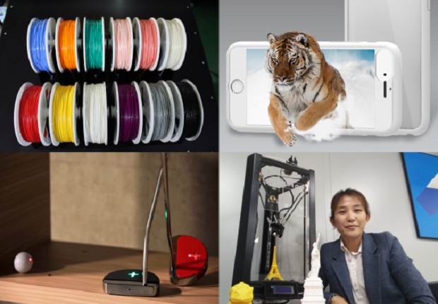 대표 전시제품(좌측상단에서 시계방향으로 풀컬러3D프린터 필라멘트 소재(㈜3D코리아), Snap3D(㈜모픽), 3D프린터 지니(㈜엘에스비), IoT기반의 스마트골프(아이디어링크(주)). (사진=3D융합기술지원센터)