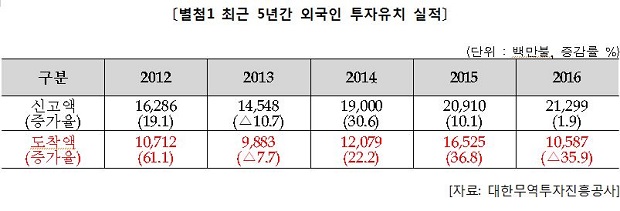 더불어민주당 어기구 국회의원(산업통상자원중소벤처기업위원회, 충남 당진시)이 17일, 대한무역투자진흥공사(코트라)로부터 제출받은 ‘외국인투자실적 현황’자료에 따르면 작년 외국인투자유치는 105억8,700만 달러로 2015년 165억2,500만 달러보다 36% 급감했다. 이는 신고액인 212억9,900만 달러의 절반에도 미치지 못한 수준이다.