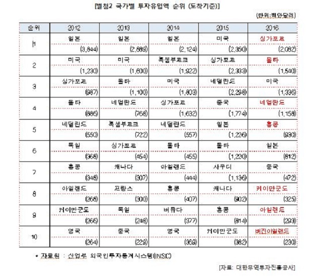 국가별로 살펴보면 2016년 중국의 투자금액은 4억7,200만 달러로 전년의 17억7,400만 달러에 비해 가장 큰 폭인 73%가 급감했고, 미국은 2016년 13억3,600만 달러로 전년의 23억5,000만 달러로 43%의 투자가 감소하면서 투자유입국 1위에서 3위로 내려앉았다. 2012년부터 3년 연속 우리나라 투자국 1위였던 일본은 작년에는 8억1,200만 달러로 전년 대비 12억2,600만 달러에서 34% 투자가 감소하여 6위를 기록했다.