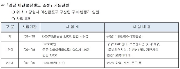 마산로봇랜드 조성사업은 내년 하반기에 1단계(공공부문)사업과 로봇테마파크를 준공해 2019년 상반기 경남 마산로봇랜드를 개장할 예정이다.