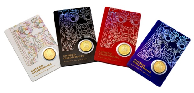 ‘카드형 치우천왕 금메달’은 순도 99.9%, 중량 1/10온스(3.1g), 직경 16㎜ 규격의 제품으로 흰색, 검정, 파랑, 빨강 네 가지 색상의 카드형 케이스에 치우천왕이 새겨진 금메달이 투명한 창에 삽입돼 있다.