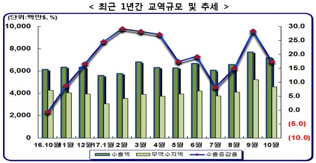 여기에 중국으로의 수출은 지난 9월 증가세로 돌아선 이후 10월 한 달 간 194억3,300만 달러를 수출, 1.7%의 수출증가율을 보이며 사드여파에서 상당부분 회복돼 가고 있는 것으로 집계됐다.