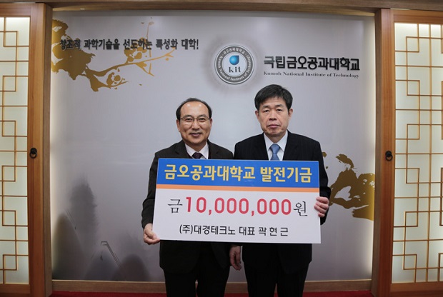 곽현근 ㈜대경테크노 대표이사가 국립금오공과대학교(총장 이상철)에 발전기금 1천만 원을 전달했다.