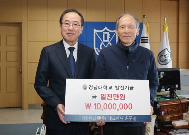 최무걸 대표이사는 “그 동안 지역사회를 빛낼 우수한 인재 양성에 매진해온 경남대학교에 발전기금을 전달하게 되어 뿌듯하다”며 “계속해서 학생들의 교육과 연구에 매진해 지역과 함께 성장하고 발전하는 대학이 되어 주길 바란다”고 말했다.