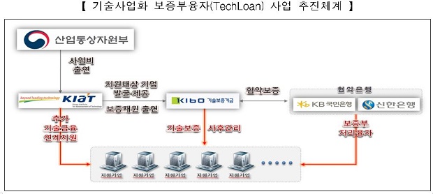 이번 협약을 통해 출시되는 ‘기술사업화 보증부융자(TechLoan) 지원 사업’은 KIAT를 통해 발굴된 우수 신산업분야 기업이 기술사업화 추진 자금을 신청하면, 기술보증기금은 기술평가를 통해 기업에게 기술보증서를 발급해 주고, 국민은행과 신한은행은 보증서를 바탕으로 금리우대 보증부 대출을 제공하는 방식으로 운용한다.