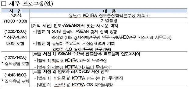 250여 국내기업 관계자와 KOTRA의 아세안(ASEAN), 인도, 러시아·독립국가연합(CIS) 주재 전(前)·현(現) 무역관장 및 해외공관 상무관이 참석해 지역별 진출 전략을 발표하고, 현지 시장동향과 정책변화를 전달할 예정이다.