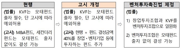 이렇게 KVF를 결성할 수 있게 되면, 펀드의 40%는 창업·벤처기업에 투자하면서 그 외 부분은 KVF의 장점인 해외투자도 규제 없이 가능해져, 실질적으로 제정법에 따라 결성될 일원화된 펀드와 유사한 구조를 갖게 된다.