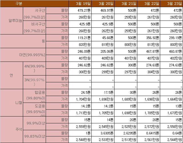 3월 22일 조달청 비철금속 비축물자 방출가격
