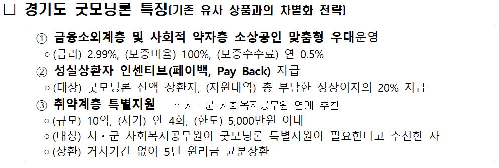 ‘굿모닝론’의 적용금리는 경기도의 이차보전 0.5%를 제외한 실제 부담 2.99% 고정금리며, 보증비율은 100%, 보증수수료는 연 0.5%다. 성실상환자의 인센티브제도인 정상부담 이자의 20% 페이백 제도도 지난해와 동일한 방식으로 운영된다. 또한 경쟁력 강화 경영컨설팅 등 사후관리 서비스도 이뤄진다.