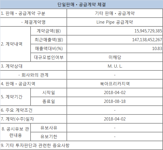 (공시) 동양철관 - 단일 판매ㆍ공급계약 체결