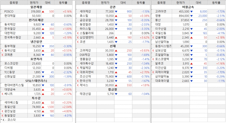 주요 철강ㆍ비철금속 업체 주가 동향 (6일 종가 기준)