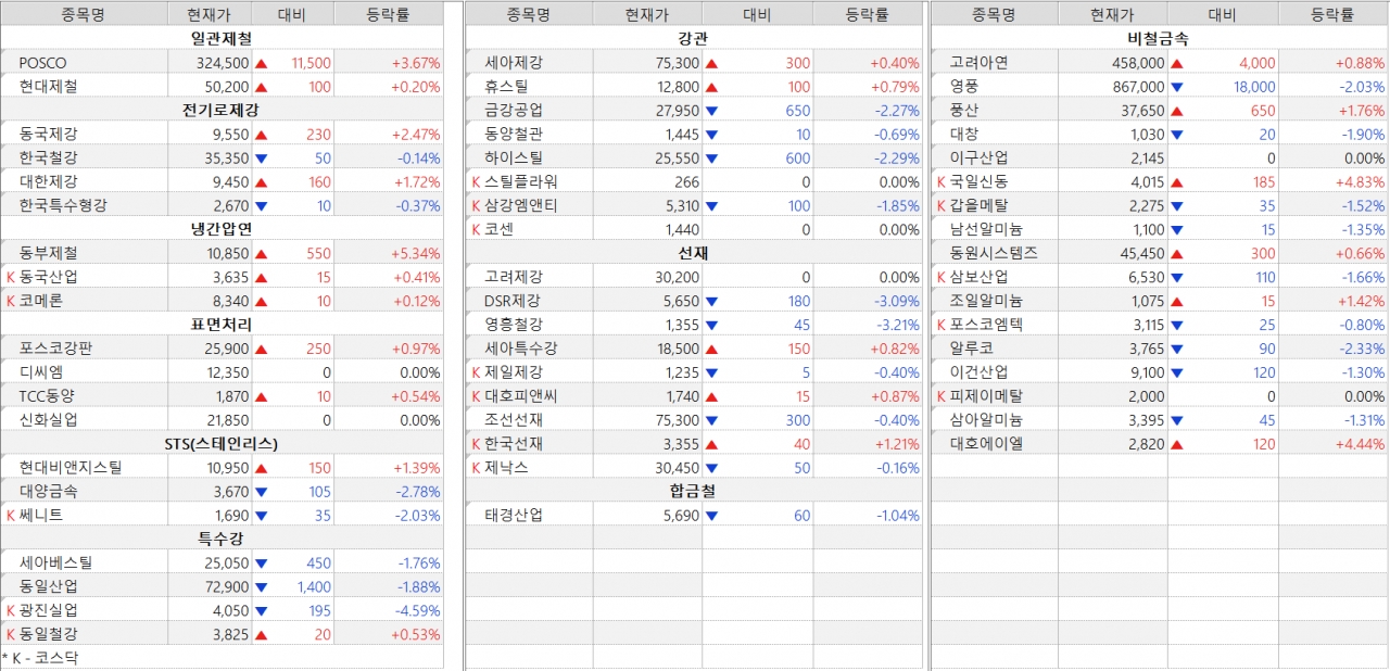 주요 철강ㆍ 비철금속 업체 주가 동향 (10일 종가 기준)