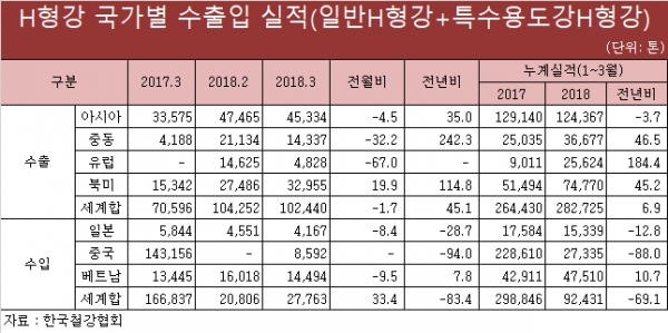H형강(일반H형강+특수용도강H형강) 3월 수출량이 증가한 반면 수입량은 감소했다.