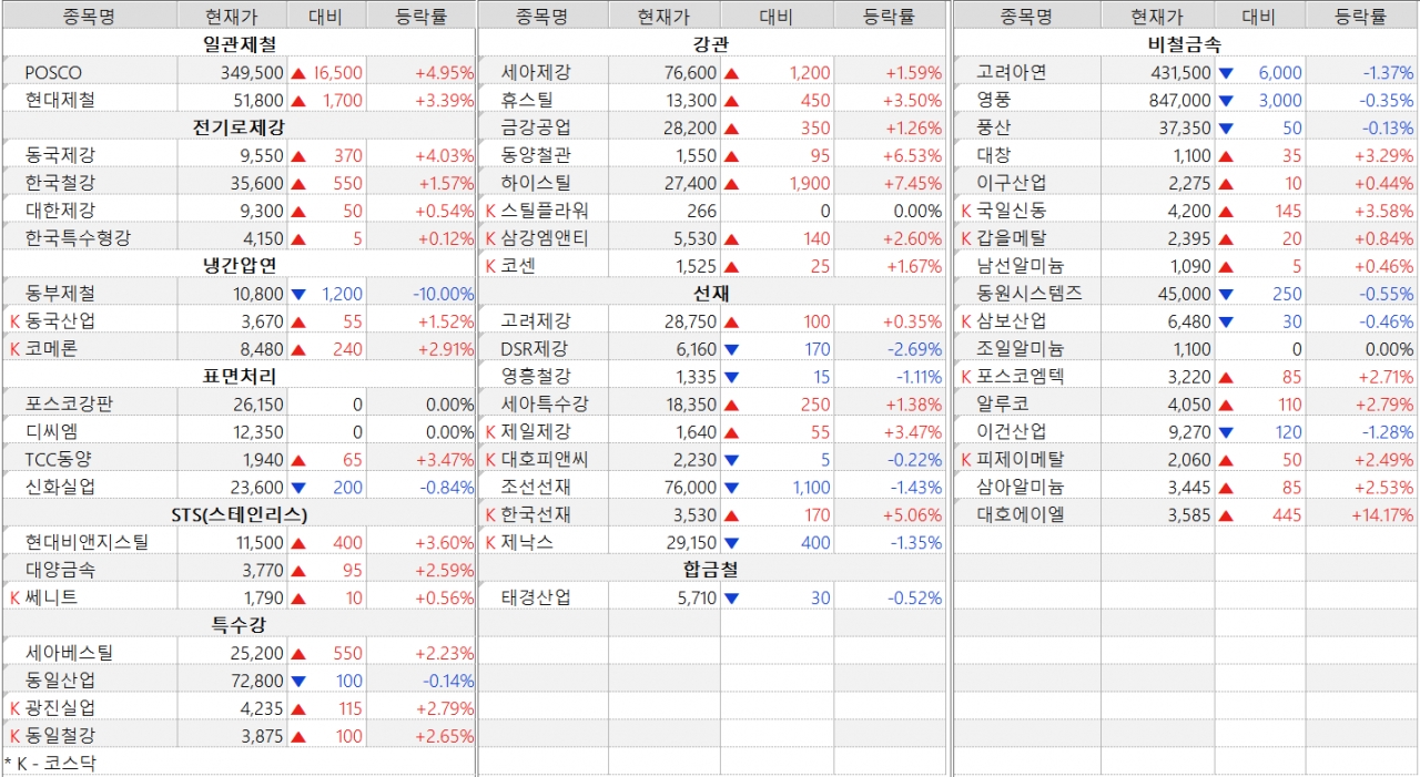 주요 철강ㆍ비철금속 업체 주가 동향 (18일 종가 기준)