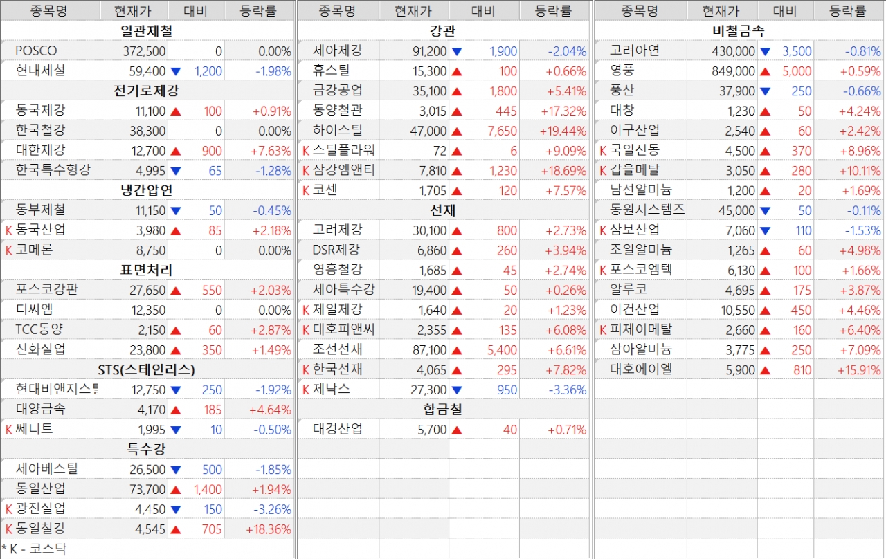 주요 철강ㆍ비철금속 업체 주가 동향 (2일 종가 기준)