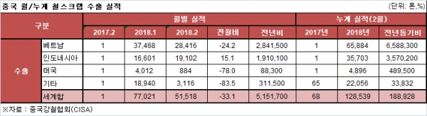 2018년 중국의 철스크랩 수출이 주춤한 것으로 나타났다.