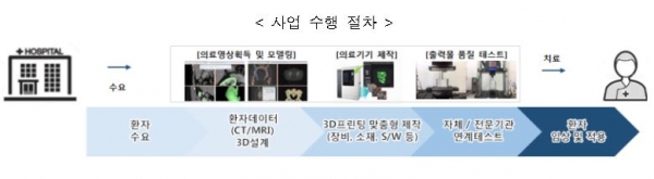 사업 수행절차는, 공모 과정을 통해 선정된 사업 수행기관이 전국의 병원을 대상으로 3D프린팅으로 제작 가능한 의료기기의 수요를 받은 후, 3D프린팅으로 제작하여 이를 병원을 통해 환자에게 적용한다.