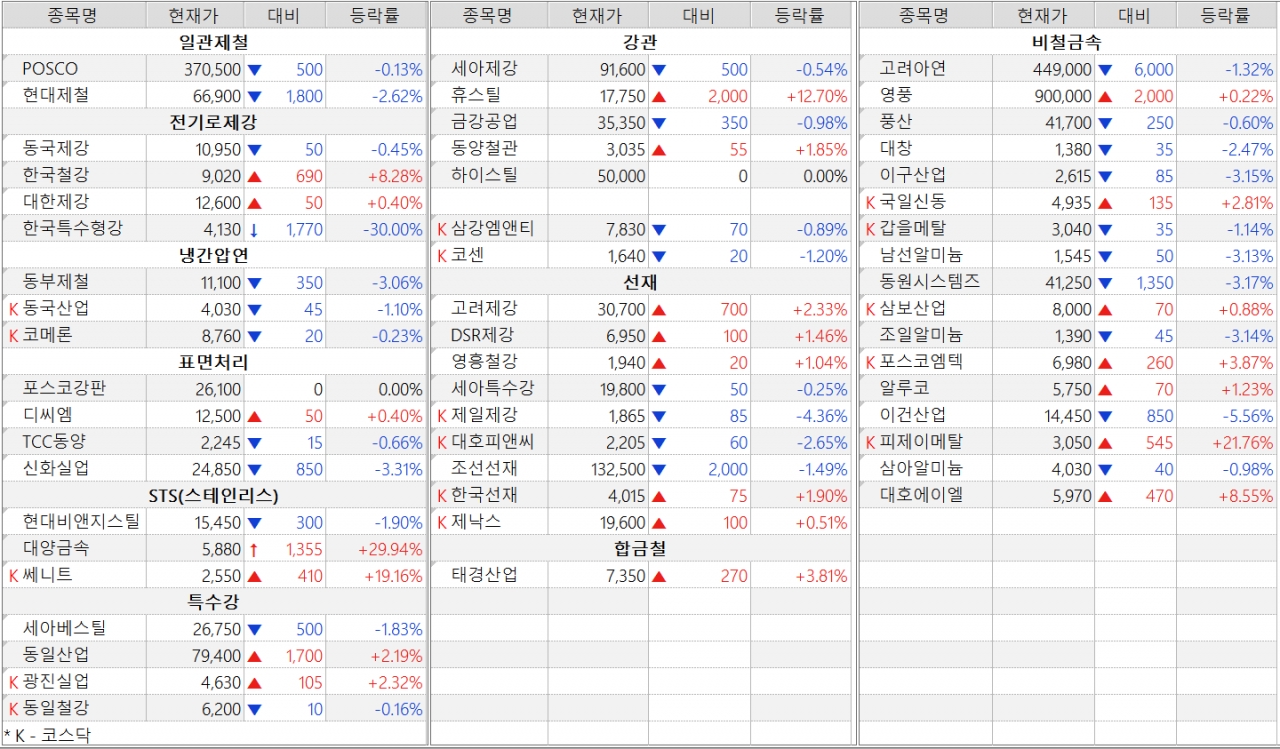 철강ㆍ비철금속 업체 주가 동향 (15일 종가 기준)