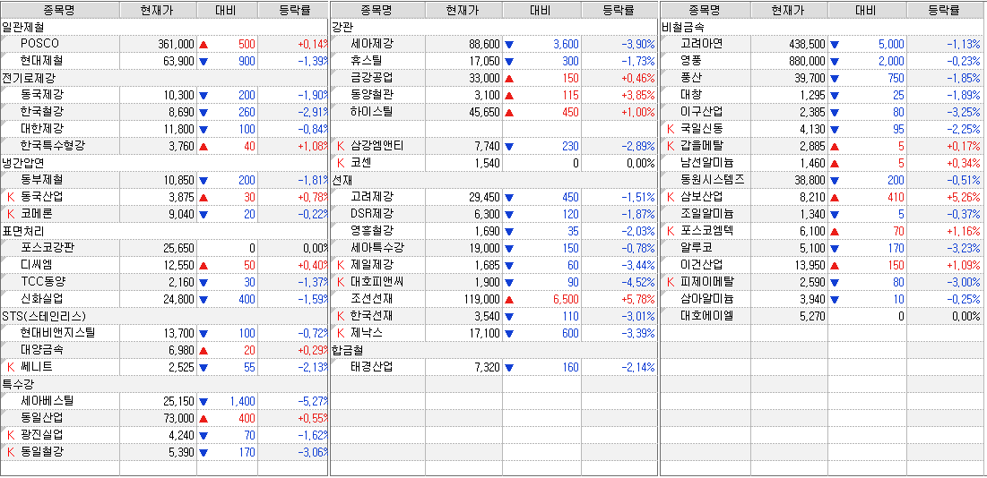 철강ㆍ비철금속 업체 주가 동향 (21일 종가 기준)