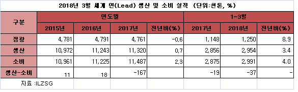 2018년 3월 세계 연(Lead) 시장은 연괴 생산과 소비가 모두 전월대비 증가했지만 소비량이 생산량을 크게 넘어서 공급 부족이 심화됐다.
