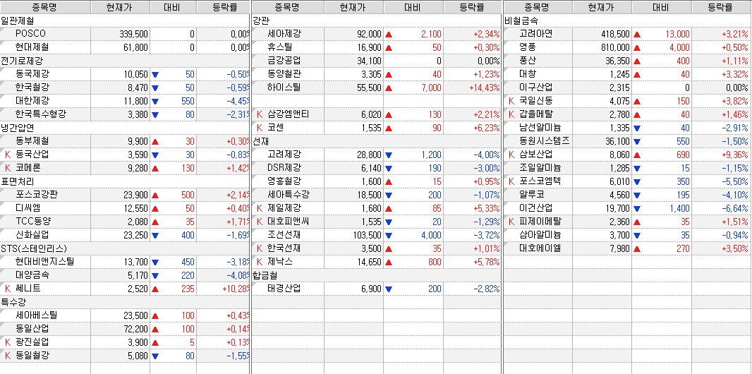 철강ㆍ비철금속 업체 주가 동향 (1일 종가 기준)