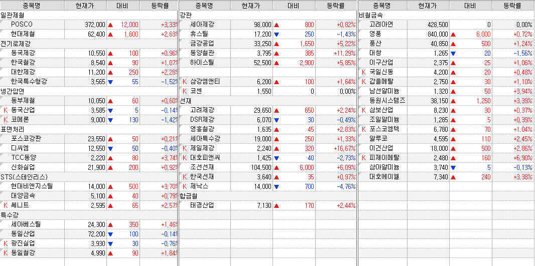 철강 비철금속 업체 주가 동향 (11일 종가 기준)