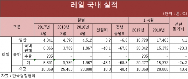 4월 레일의 생산량 및 판매량이 전년 동월 대비 감소했다.