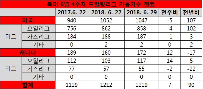 6월 4주차 북미지역 굴착기(Drilling Rig) 가동기수는 총 1219기로 지난해 같은 기간 1129기 보다 90기 증가했다.