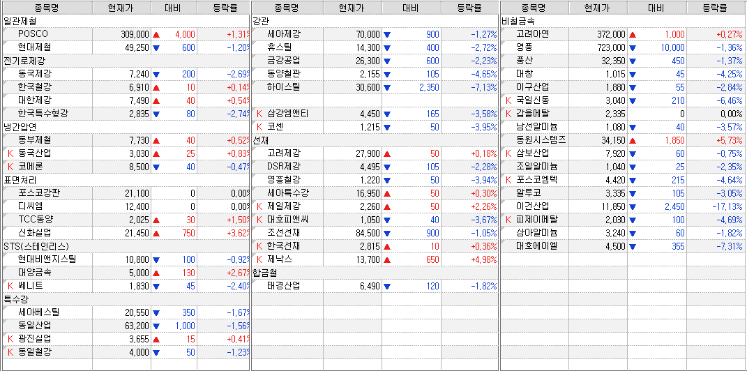 철강 비철금속 업체 주가 동향 (5일 종가 기준)