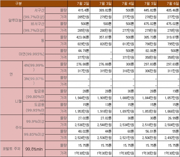 7월 6일 조달청 비철금속 비축물자 방출가격