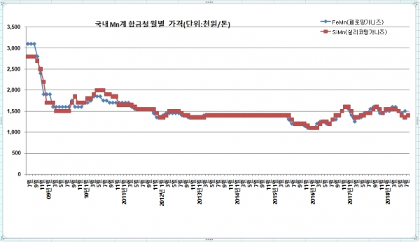 Mn 계열 합금철 가격은 2018년 1월초 큰 변동성을 보인 바 있지만 수요 부진 영향으로 인해 최근까지 약보합세 양상을 이어가고 있다.